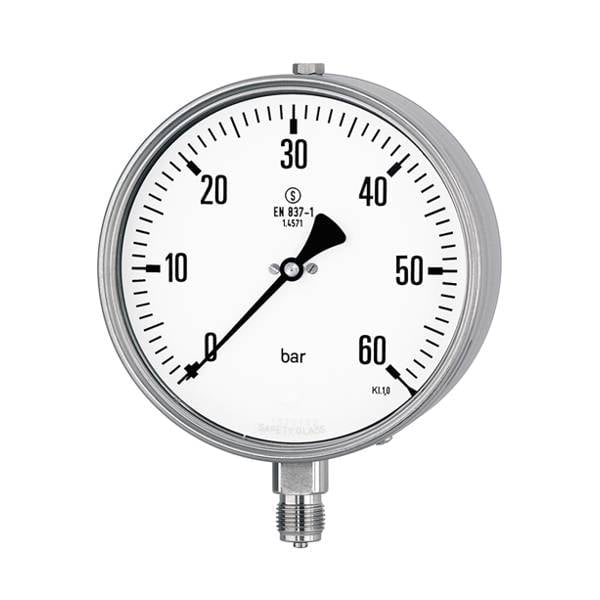 High-precision Safety Pattern Test Pressure Gauge 160mm, EN837 Class 0.6. Versatile, durable stainless steel construction for diverse applications. From vacuum to 1,600 bar.
